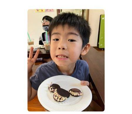オレオを半分に分けてチョコペンを塗り、ポン菓子を歯に見立てて並べていきます!